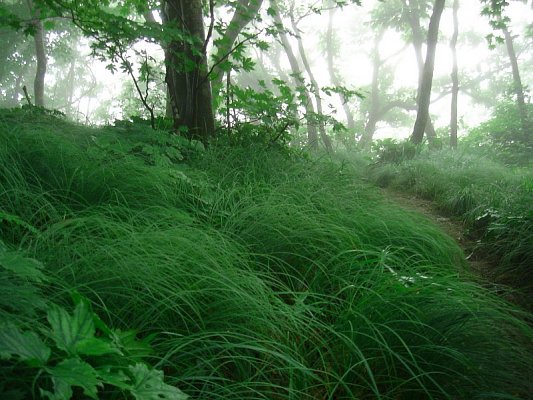 푸를름과 안개가 가득한 숲길을 따라 촉촉하게 물망울을 담고있는 나뭇잎들 아름다움을 보여준